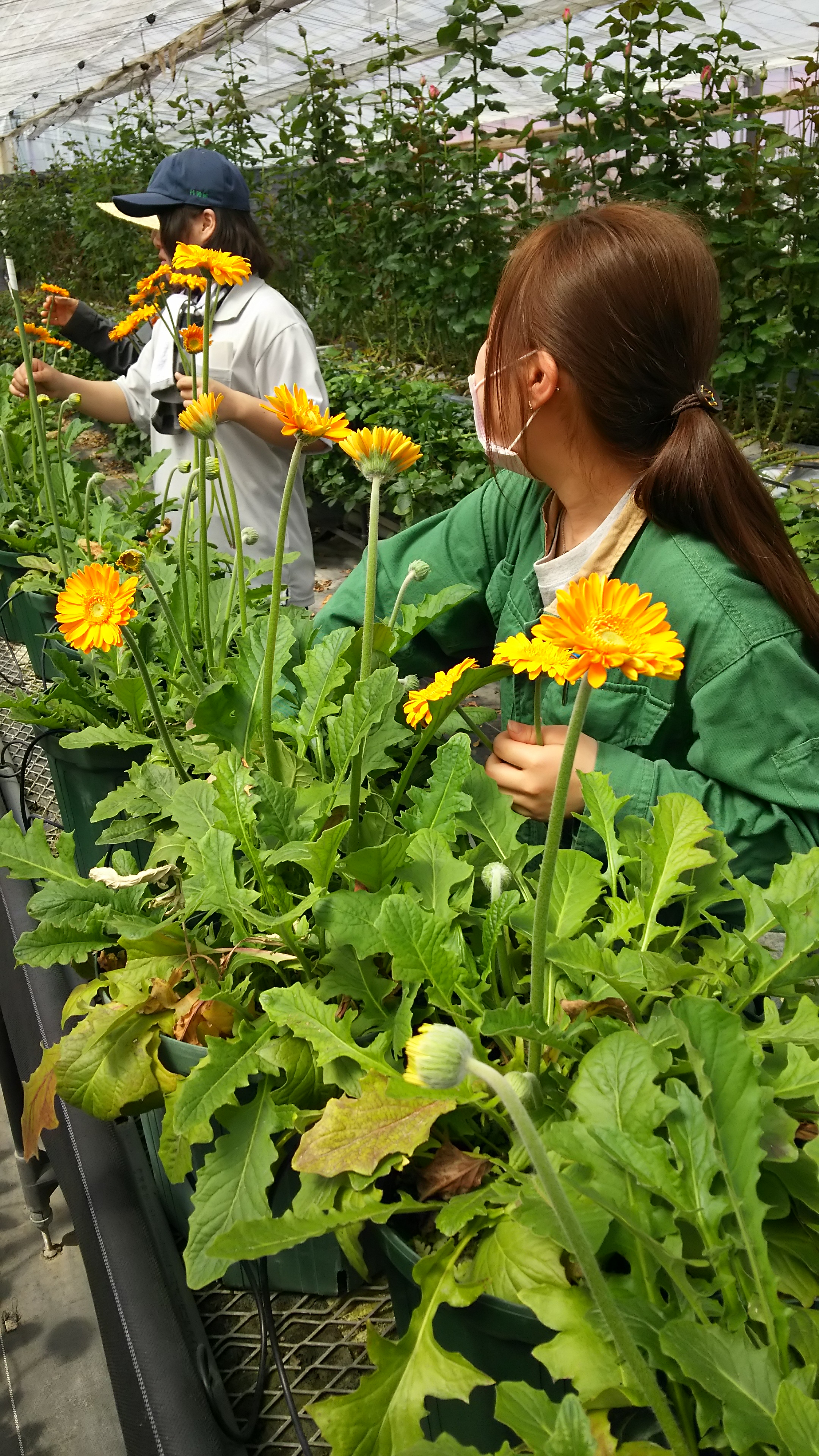 今日は、アカデミー1号温室のガーベラの収穫と葉かきを行いました。ガーベラの収穫ははさみ等の道具は使わず、株元から引き抜くように行います。収穫したガーベラは、花を保護するためにガーベラキャップをつけます。ガーベラの葉かきも収穫と同様にはさみは使わず、株元から引き抜くように行います。葉かきは、株もとの風通しをよくして病気を防ぐために行います。収穫も葉かきもちょっとしたコツがあります。1年生のみなさん、コツをつかんで上手にできましたか?