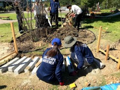 花フェスタ記念公園・実習フィールドでの卒業制作の作庭作業が佳境を迎えています。この日は園路の延石の据え付け、植栽地と芝生の境目にエッジ材を設置しました。エッジ材を設置することにより、植栽地に芝生が入り込むのを防ぎ、植栽地と芝生の境目を綺麗に仕上げることができます。園路となる延石の据え付けは、丁張を目安として左右の位置、高さ、曲線の中心点からの方向を確認しながら据え付けるため、時間がかかります。スコップ、ツルハシでの掘削作業は、手にマメができるほどの固い地盤で苦労しましたが、ほぼ予定通りに作業を進めることができました。みなさんお疲れさまでした。もう少しです。頑張りましょう。