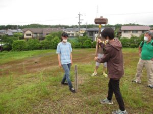 樹木植栽予定地に杭を打つ学生