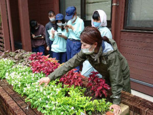 本学非常勤講師、NHK趣味の園芸でおなじみの天野麻里絵先生の説明の下、7月10日に花修景実習Ⅰで草花苗の摘心をしました。ジニア、トレニア、ベゴニア、センニチコウ、サルビア・ファリナセア、ヒポエステス、デュランタといった草花苗について、摘心の仕方をそれぞれ学んだ後、実習開始。学生は摘心する位置を確認しながら、ハサミを入れました。ペンタスが咲きかけている本館前の植栽地(第3花壇)は、7月26日、27日に開催されるオープンキャンパス後、摘心して欲しいとその花壇担当の学生にリクエストをしたところ、「27日の後に摘心します」との返事でした。何かのイベントに向けて草花苗を綺麗に見せるのは、公園管理・運営にとって非常に重要なことだと思います。