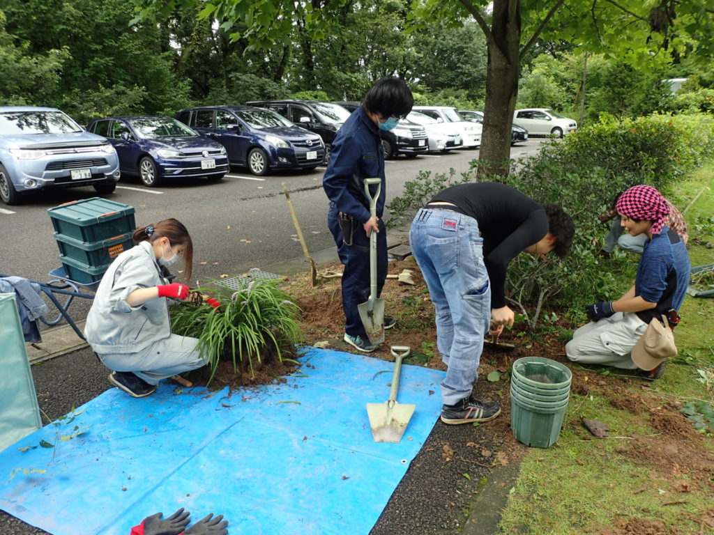 7月28日、1年生の有志を募りキャンパス内植栽地での花壇づくりを始めました。幅2メートルの植栽地内の整備です。この日は整備区域内の既存植物の撤去、移植、鉢上げを行いました。その後、ゼミ室で整備する内容についてミーティングを行いました。走りながら考える方式でいきます。