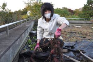後半は、園芸福祉プログラムづくりとして屋上緑化園でサツマイモ掘りしました。例えば幼稚園・保育園児に園芸福祉活動としてサツマイモ掘りをしてもらうにはどのような手順ですれば良いのか、次回授業で園芸福祉プログラムを発表してもらう予定です。