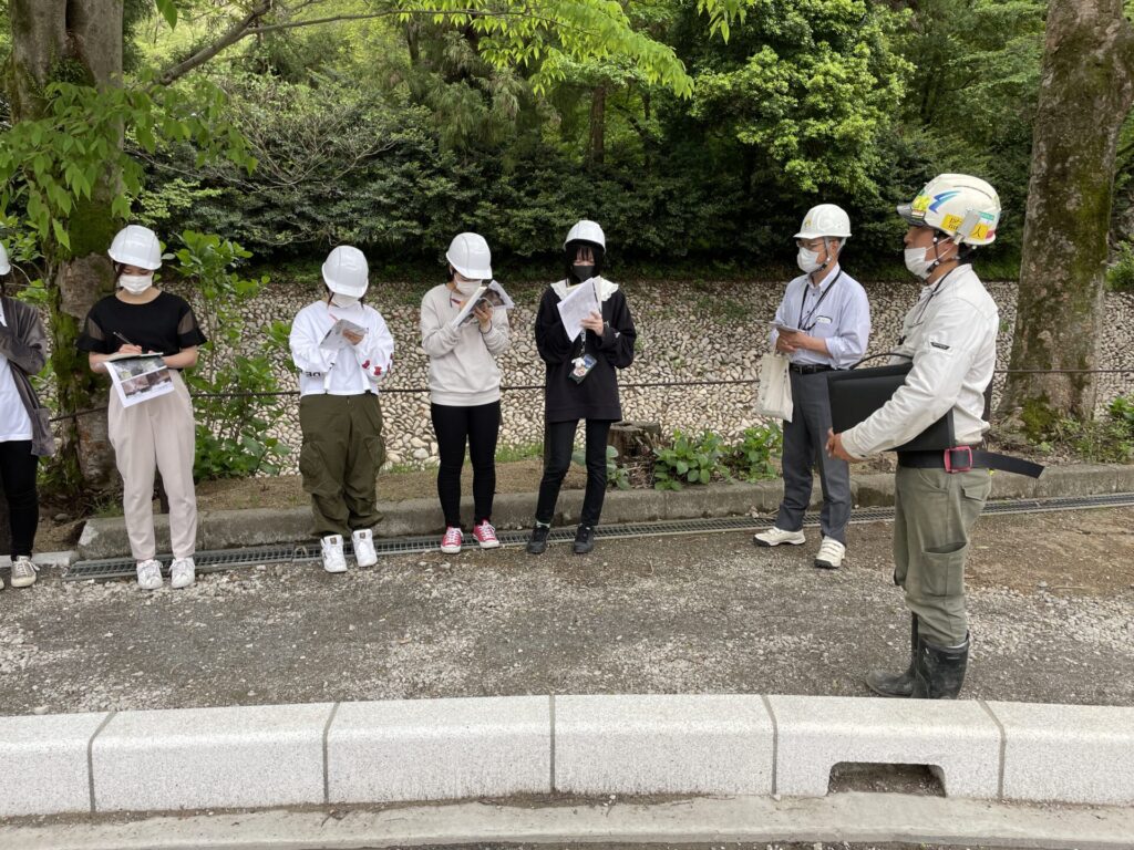 4月27日、連携協定を締結している(株)岐阜造園様のご厚意で施工現場の見学会を行っていただきました。施工現場は岐阜公園内の緑道修景工事です。施工内容は歩道の整備と水路法面の修景工事です。堆積土砂で覆われていた護岸を伐木や除草で清掃し、90年前に施工された玉石張護岸の本来の形状を活かした景観づくりを行う工事です。施工現場を見学できる貴重な機会となりました。お忙しい所、工事のご説明をいただきました現場の担当者様や発注者である岐阜市役所のご担当者の方々に感謝申し上げます。