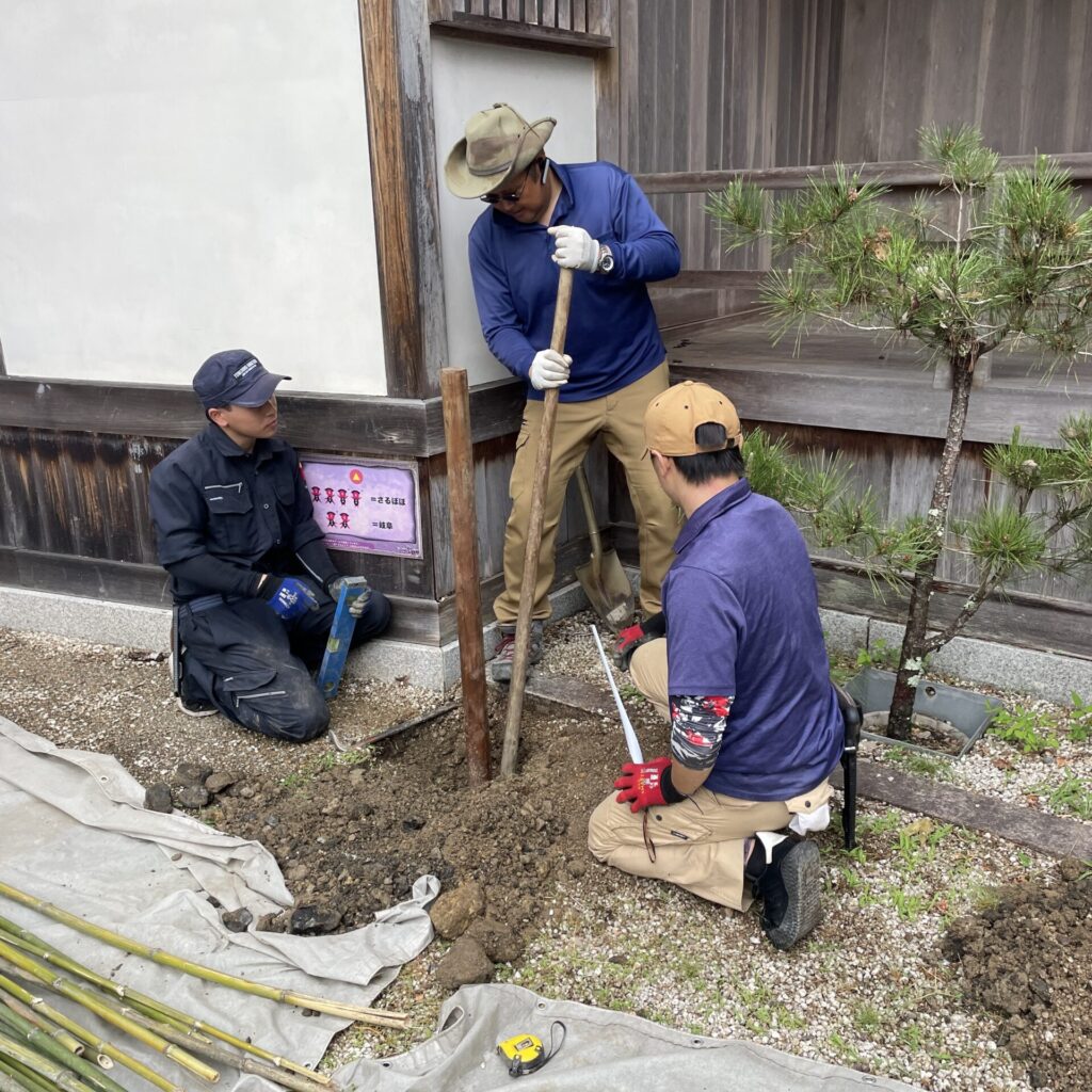 5月30日、ぎふ清流里山公園で(一社)岐阜県造園緑化協会青年部研修大会に参加させていただきました。協会青年部は技能の向上、次代を担う造園技能者の育成や会員同士の交流を図ることを目的として様々な取り組みを行っておられます。今回の研修大会には、当アカデミーの学生と加茂農林高等学校環境デザイン科の生徒さん達と参加させていただき、公園内の茶室と能楽堂周辺の竹垣づくりを行いました。現場のプロの方々に直接ご指導いただき大変貴重な経験となりました。青年部の皆様、誠にありがとうございました。
