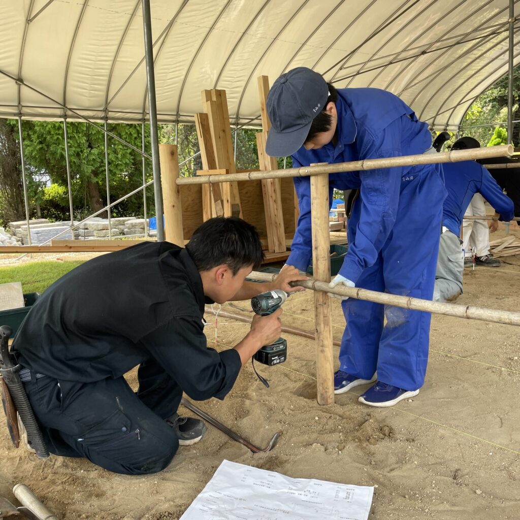9月5日、6日の造園施工・管理実習Ⅲでは、建仁寺垣の制作を行いました。この建仁寺垣は1級造園技能検定の課題となっているものです。これまで習得したさまざまな技能を用いて制作することができました。課題の内容としては、建仁寺垣の他に蹲踞、延段、景石、植栽があります。次回の授業で完成させましょう。