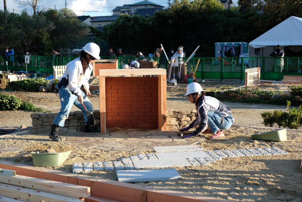 1日目はアルコーブ、石積み、石張り、敷石、小舗石、フェンスの設置まで行いました。制限時間ギリギリでの完成となりました。2日目はアーチ、植栽を行い、無事制限時間内に完成させることができました。