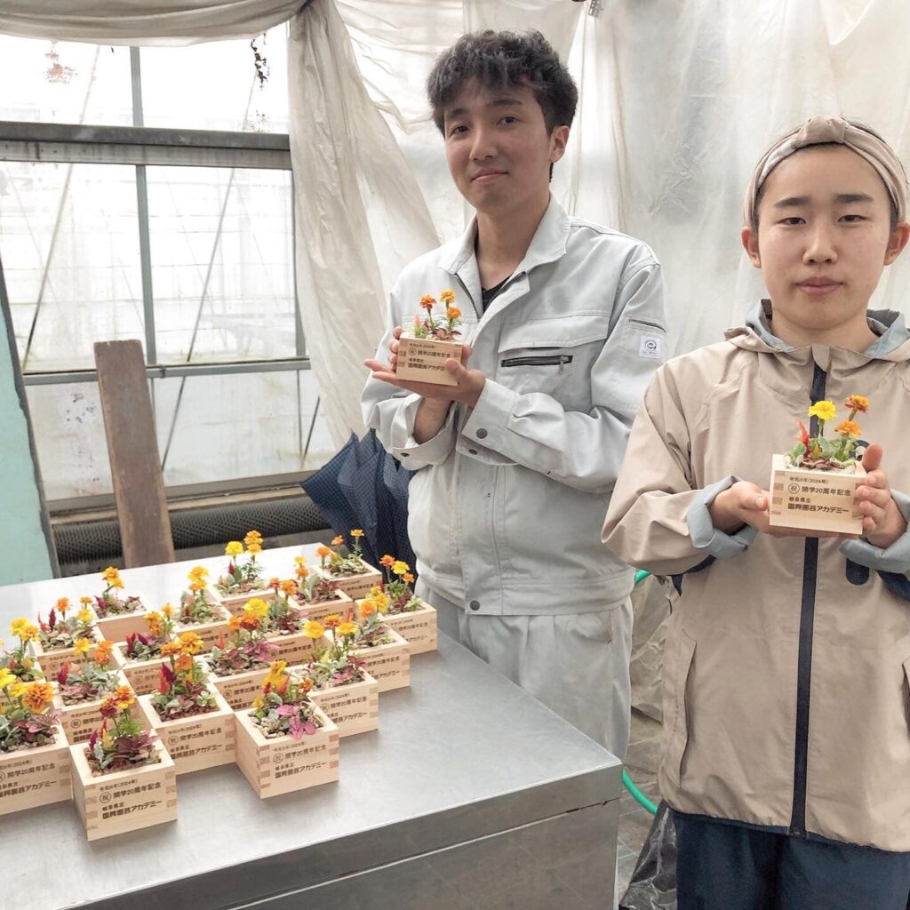 1年生の花き生産実習で、枡マイクロ寄せ植えを制作しました。