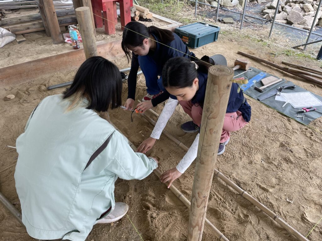 6月27日と7月11日の造園施工・管理実習Ⅰでは、造園の基本技能を学ぶことを目的として、3級造園技能検定の課題を用いて、竹垣制作、縁石・敷石の据え付け、植栽を実習しました。3級造園技能検定は造園の入門とも言える資格で、高校生や学生が多く受検します。竹垣は簡単な四ツ目垣ですが、初めての学生にとっては手順が多く、なかなかうまくいきません。2回の実習で課題すべてを完成させることができました。本当の試験は一人で2時間以内に制作しなければなりません。