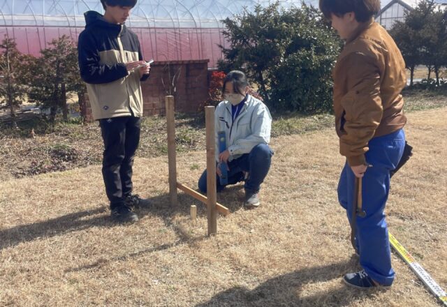 2月17日、測量実習では、丁張のかけ方を学びました。丁張(やり形)は、工事現場で建造物の位置、形状、高さ、勾配、方向など...