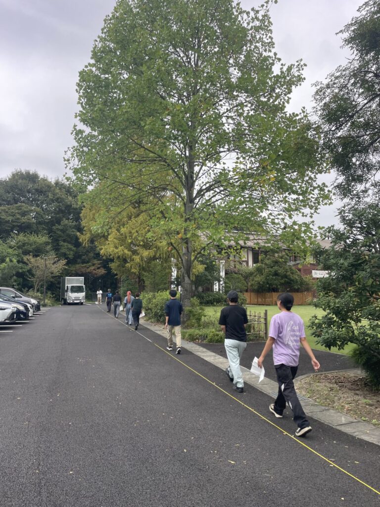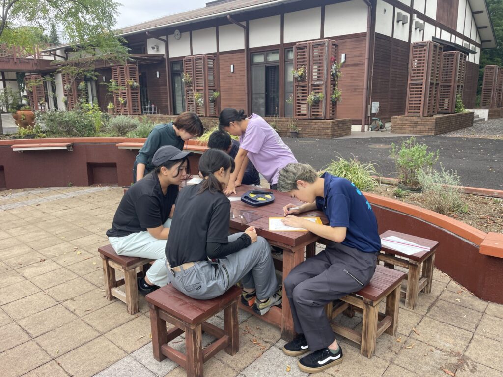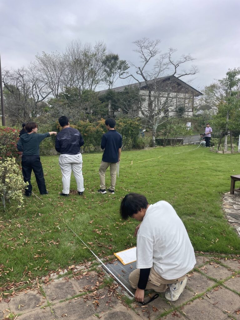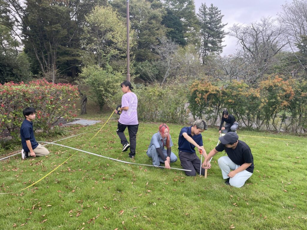10月7日、測量実習では、自分の歩幅を計測し、学内を歩測で計測しました。2時間目は学内の芝生広場内に打たれた木杭と20周年記念樹の位置を図面に記すにはどうしたらよいか、グループで考えてもらいました。使用できるのはコンベックス、三角スケール、巻き尺、コンパス、三角定規です。グループごとにそれぞれ異なる方法で計測、作図しました。限られた道具を用いて最も正確な方法を全員で考えて行いました。「自分で考え、行動する」という姿勢が、主体的に学びに向かう力を育てるとともに、学びの原点であると考えています。