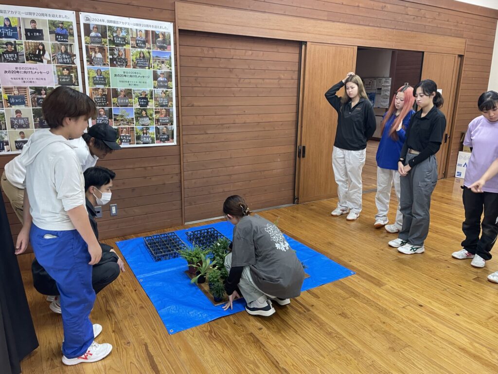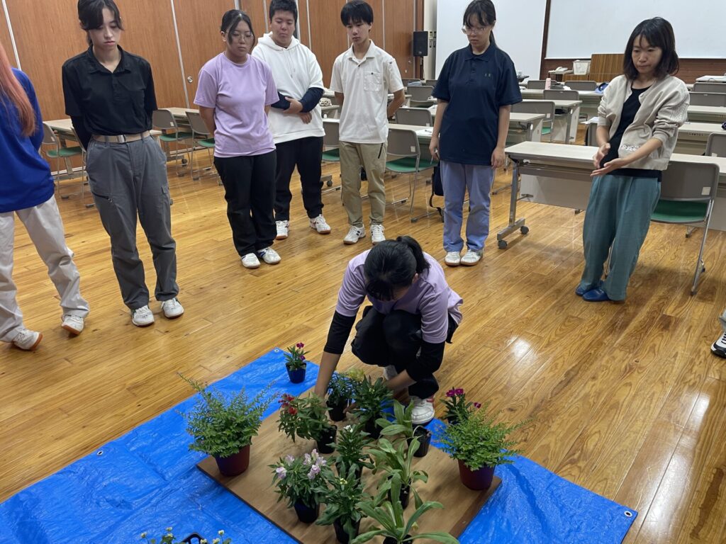 10月15日、造園施工・管理実習Ⅱでは学内の花壇の植替えを行いました。花壇の植え替えをおこなう前に教室で配植について学びました。等間隔で植栽するだけではなく、自然風に不等辺三角形を意識して植栽することもできるようになっていきます。