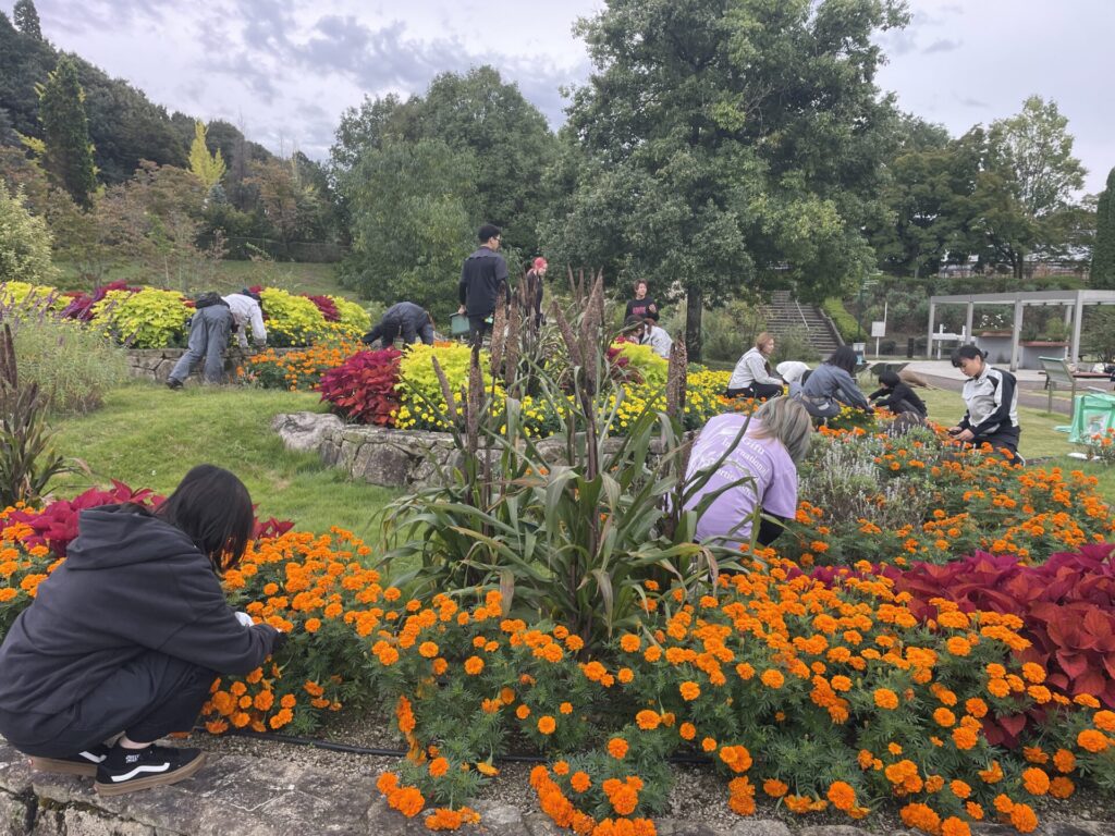 10月21日、花修景実習Ⅱは、ぎふワールド・ローズガーデン実習フィールド花壇のメンテナンスを行いました。9月に2年生が植え替えた花の花柄摘み、除草などを行いました。これから約1年間、この花壇の植替えやメンテナンスを行っていきます。公園内全体の花の生育状況、見頃などをふまえ、この花壇のメンテナンスの仕方を学んでいきます。