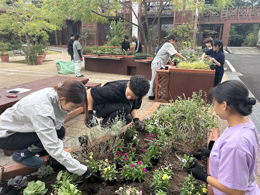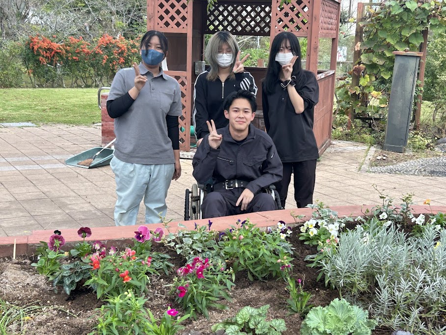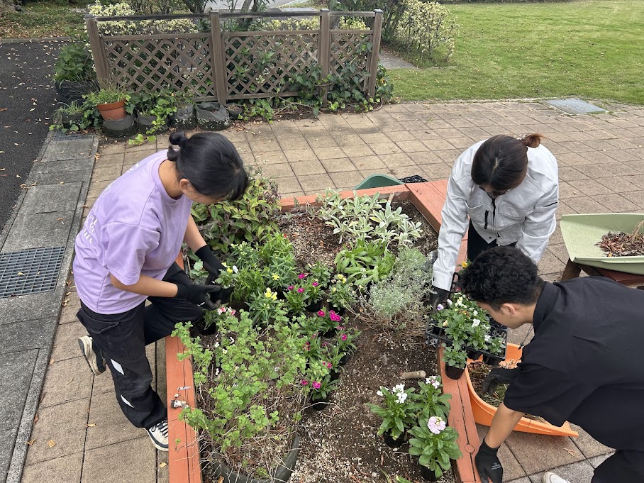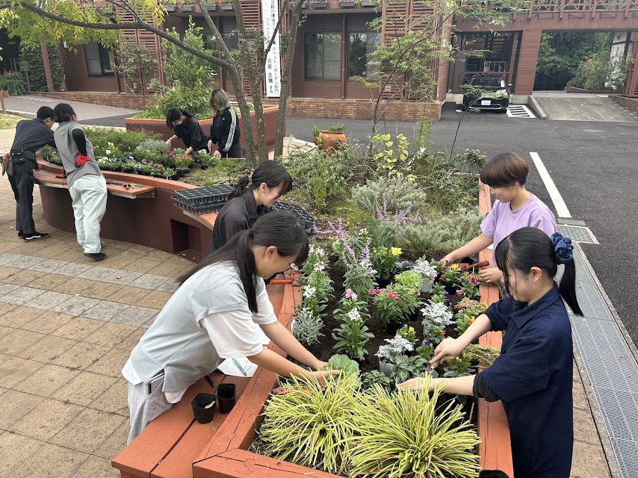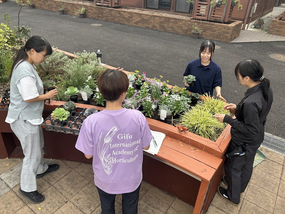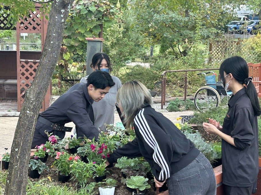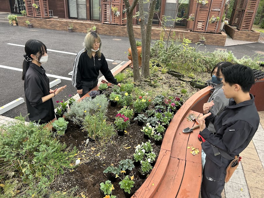 そして実習は、園芸福祉活動実践へのモデルガーデンを作ります。3グループに分かれて、①車いす利用者・高齢者でも楽しめる花壇、②子供と一緒に楽しめる花壇、③視覚障碍者でも楽しめ、ストレス解消になる花壇の各テーマのもとに、園芸福祉ガーデンとしての機能を備え、ふれあいがあり、誰もが楽しめる花壇づくりを話し合い、計画して完成させます。限られた時間と場所、植物材料の条件で検討・対処しなければならないことがたくさんあります。(by imanishi)