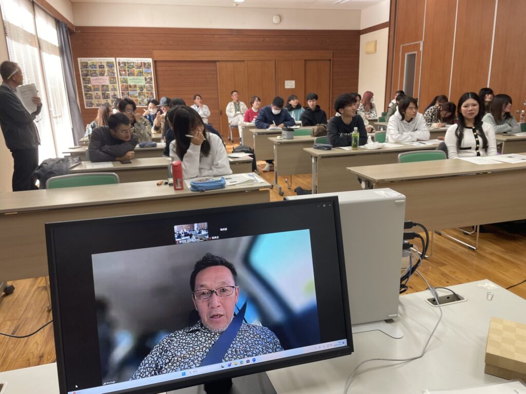 11月19日、植物ビジネス論では、(株)辻井造園の辻井博行社長を講師にお迎えして授業を行っていただきました。が、交通渋滞により授業開始時間に間に合わないということで、急遽、オンライン授業となり、車中からのオンライン講義という、アカデミー史上初の試みとなりました。約45分遅れで到着され、後半は対面での講義を行っていただきました。(株)辻井造園に就職している卒業生も一緒に来校してくれました。