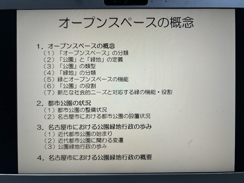 11月4日の第1回目は、オープンスペースとは?公園とは?緑地とは?緑の機能と役割そして公園緑地の歩みについての講義です。