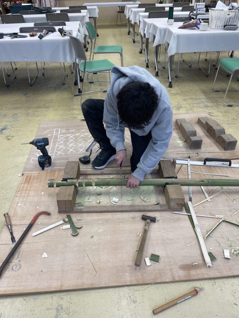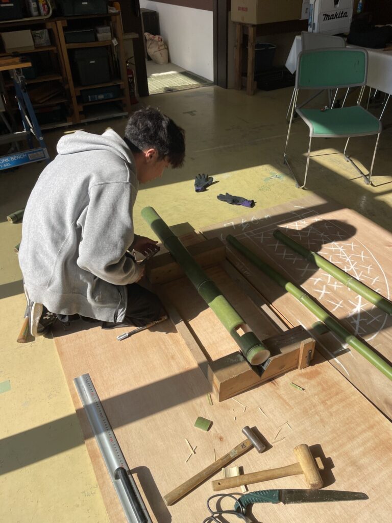 11月20日、卒業研究・卒業制作では、2年間の総まとめとして、造園にかかる研究・調査や技能習得を目指しています。光悦寺垣の制作をテーマとしています。光悦寺垣とは、京都の光悦寺を本歌とする、曲線と菱形の格子が特徴の竹垣です。細く割った竹を丸く曲げ、その中に菱格子を組んだものです。庭園の仕切りやアクセント、袖垣として用いられます。制作には高度な技術が必要となります。