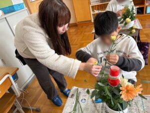 岐阜県が行う花育事業『岐阜の花で飾ろう私の学校』の一環として、NFD((公社)日本フラワーデザイナー協会)の方々が実施されたフラワーアレンジメント体験教室のサポートをさせていただきました。