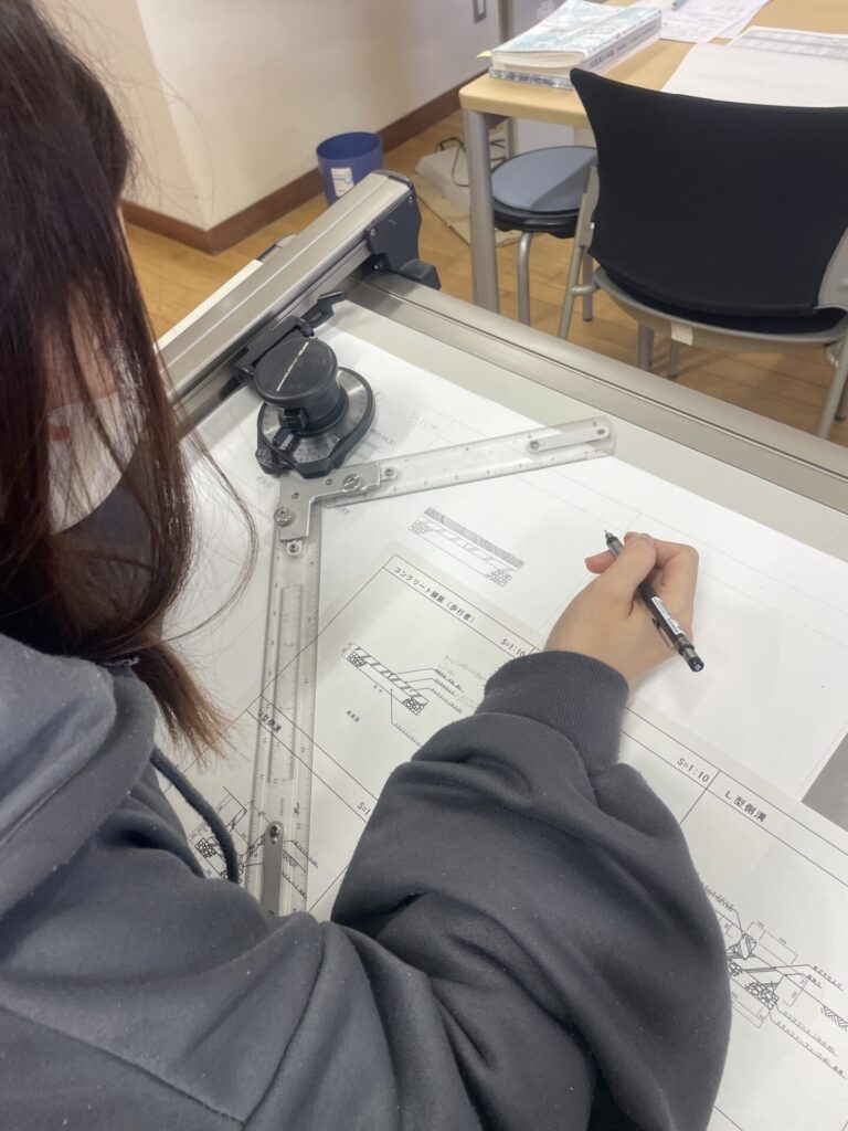2月3日、製図実習では詳細図を製図しました。詳細図は、現場で施工する際に欠かせない図面で部位の寸法や材質、材料、仕上げ方法などが詳細に記載されたものです。これを見れば施工できる精度の図面になります。そこには様々な専門用語であったり、記号、規格が記載されていたり、図面作成のルールがあります。それら一つ一つの知識があり、現場での施工をイメージできなければ図面を描くことはできません。現場の経験と図面の作成をバランスよく学んでいきます。