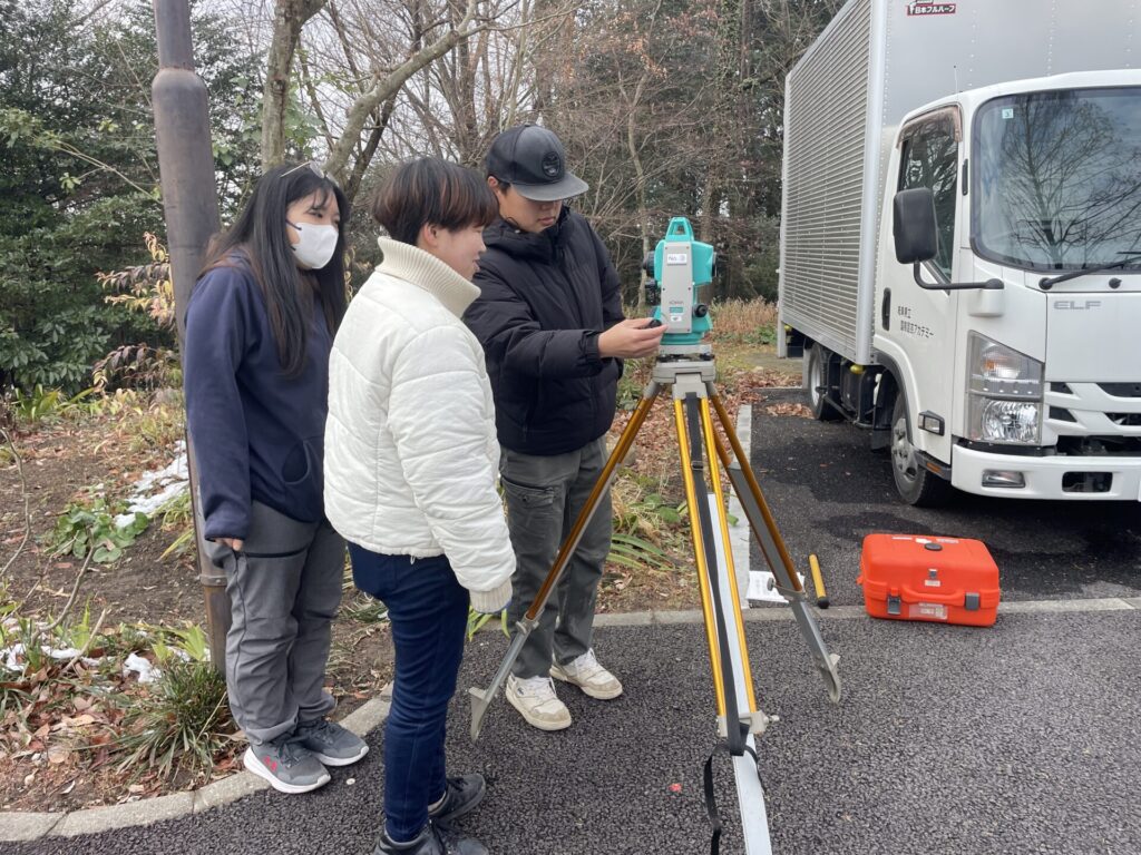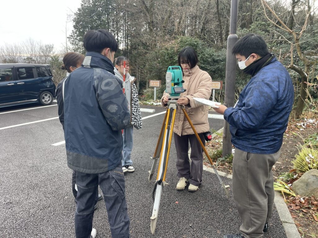 1月13日、測量実習では、トータルステーションの据え付け、操作方法について学びました。トータルステーションとは、水平角・鉛直角(角度)と距離を同時に高精度で測定できる測量機器で、角度を測る「セオドライト」と距離を測る「光波測距儀」の機能を一体化した測量機器です。測量機器も進歩しており、GPSやドローンを使った測量技術が次々と開発されていますが、測量の原理を理解しておくことが、将来の仕事で役に立ってくると考えています。