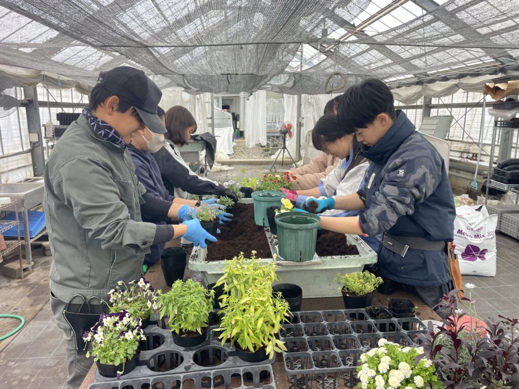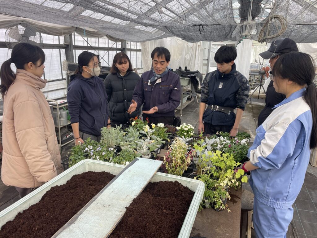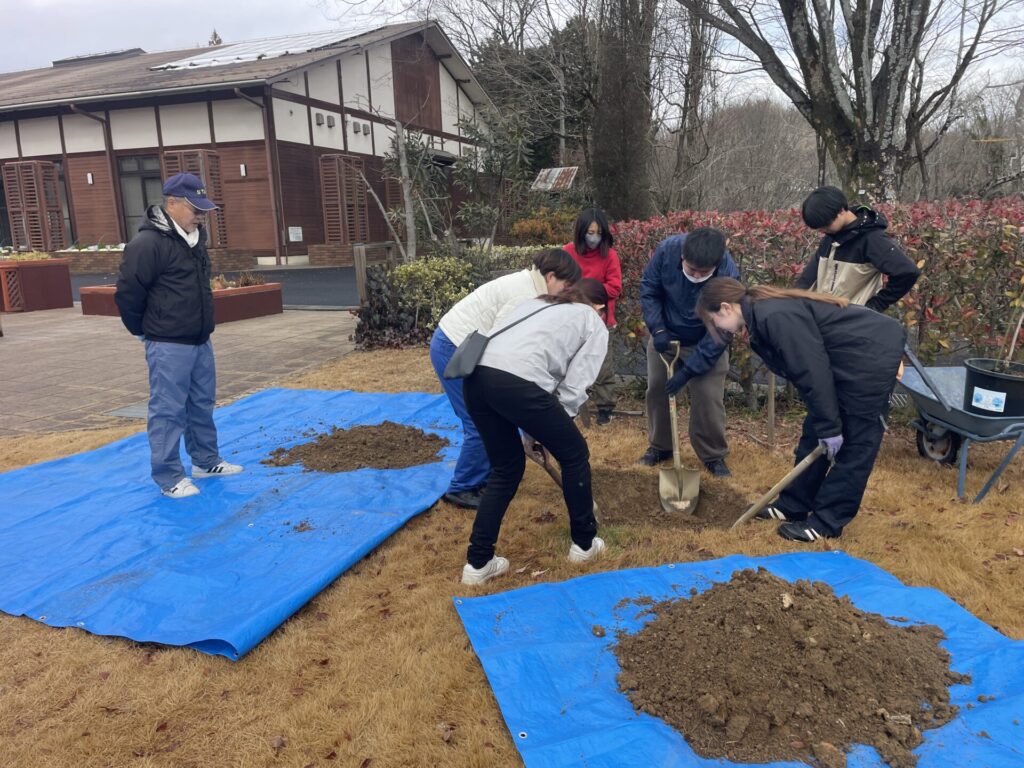 1月14日、造園施工・管理実習Ⅱでは、2班に分かれて、淡墨桜の植栽と花苗の鉢替えを行いました。淡墨桜は、岐阜県本巣市の根尾谷・淡墨公園にある桜で、樹齢1500年以上のエドヒガンの古木です。昨年、ぎふワールド・ローズガーデンで行われた都市緑化祭で植樹された苗木の予備分をいただき、当校に植栽しました。花苗の鉢替えは、昨年末にJR岐阜駅アクティブGの花飾りに使用した花苗を、4月に参加する「尾張でお庭展」で使用するために鉢のサイズを大きくしたり、切り戻しを行いました。イベントの日程に合わせて開花調整するためには、どのようにメンテナンスしていくかを学んでいきます。