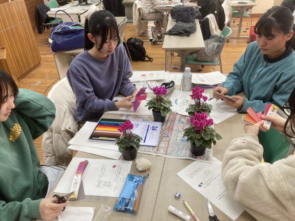花苗の色彩は、花はもちろん葉や茎の色も大きく影響し、植物に合う鉢色を選択することでより商品としての魅力が高まります。各グループで選んだ花苗をもとに色彩の分析や、商品性を高めるコンセプトを話し合い、最後はお互いに発表しあいました。花の魅力、色の奥深さを感覚だけでなく、理論でも語れるようになりましょう!