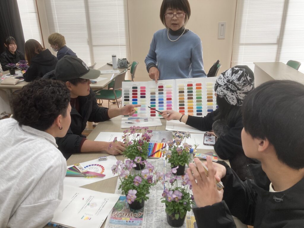 毎回商品デザイン力を高めるための色彩学について学んでいる本講義ですが、第5回目のこの日は「植物カラーコーディネート」と題して、実際に花苗を使用して授業を行いました。