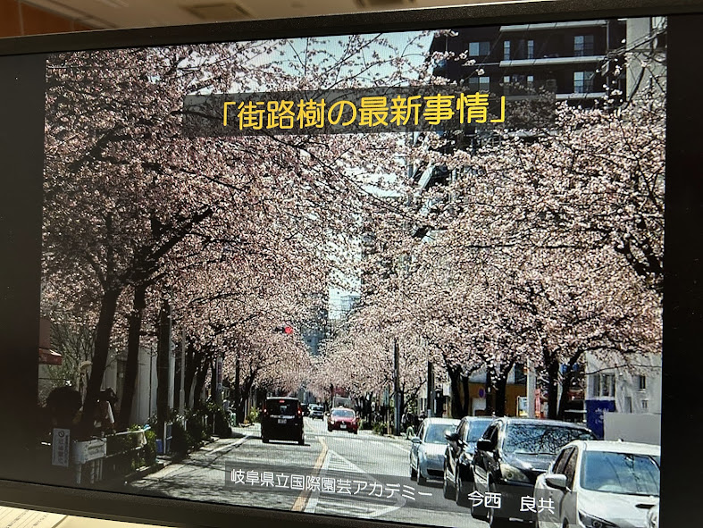 道路における緑への期待、街路樹の変遷、道路における法規制、道路空間緑化の計画と設計・維持管理、街路樹管理の課題と今後の対応について、事例写真を見てもらいながら解説しました。