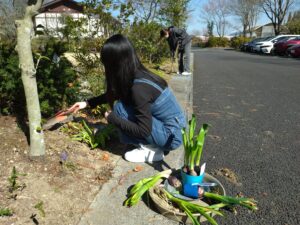 4月の入学式に向けて花壇のメンテナンスを行いながら