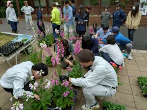 夏に向けて校舎周りの花壇に1年草苗を定植しました。
