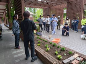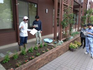 各花壇に定植する苗についての特徴などを予習してきてもらい、全員の前で自由に報告してもらいました。