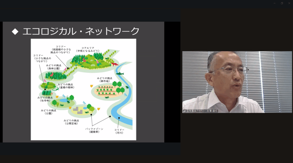 今回の講師は本校の古澤顧問が務めました。公園の機能がどのような経緯で追加されてきたのか解説し、その後今年度実施してきた「緑の研修会シリーズ」の内容を交えながら近年の公園緑地政策について講義を行いました。