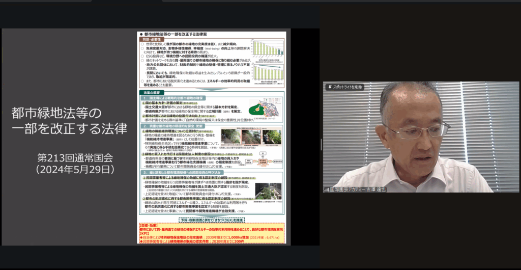 後半は、令和6年に改正された都市緑地法をベースに、公園緑地に関する政策によってどのような動きがあるのか解説がありました。優良緑地確保計画認定制度(TSUNAG)に認定されている計画の例について紹介がありましたが、今後の参考として実際に見に行ってみたいですね!
