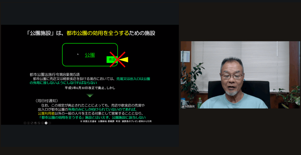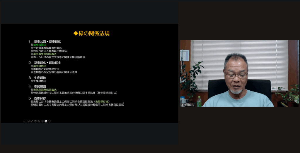 緑の施策の体系とそれに関係する法規の事、「都市公園」、「公園施設」の定義等、様々な内容を写真や図を使ってより分かりやすく説明しました。参加された方からは「業務に関係の深い法律をピックアップして説明いただけたため、大変勉強になりました。」「今西先生のお話は実体験からのお話もあり理解しやすい。」等、今回の講座に対して肯定的な感想が多く寄せられました。今後も、知っておきたい知識について講座を通してお伝えしていきます。