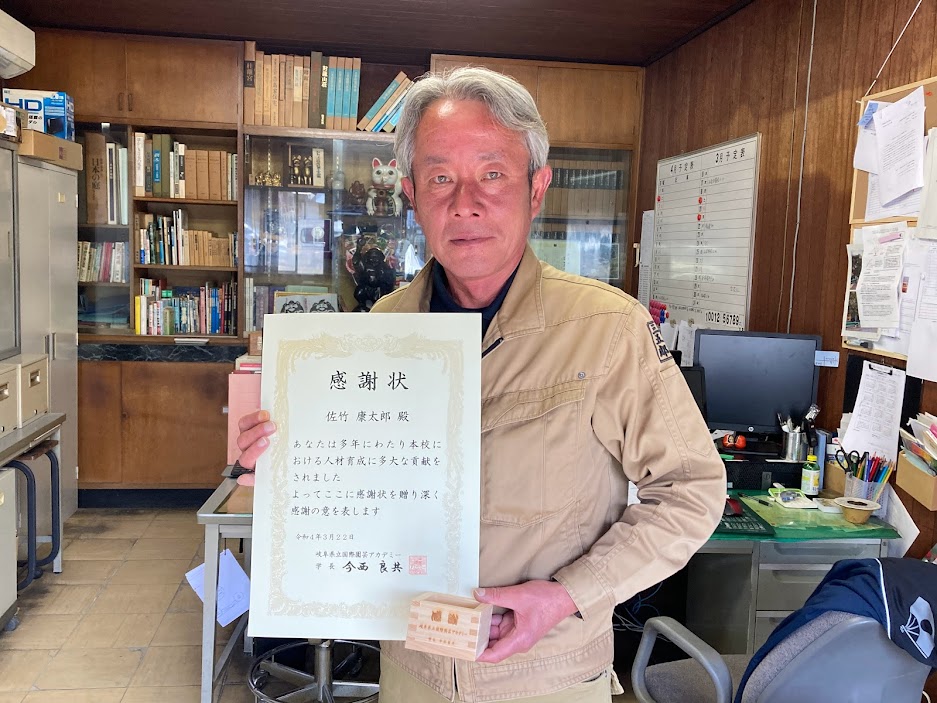 3月30日、今年度まで長年にわたり本学の非常勤講師として人材育成に多大な貢献をいただきました㈱三五郎園代表取締役社長の佐竹康太郎氏に「感謝状」を送り深く感謝の意を表しました。造園施工・管理実習の授業において、卓越した造園技術と知識で多くの学生を指導いただき、卒業生の就職先としても引き続きお世話になっております。また、文化財庭園保存技術者協議会の副代表としても全国の庭園の修復保全に尽力をされており、造園会には欠かせぬ方となっております。