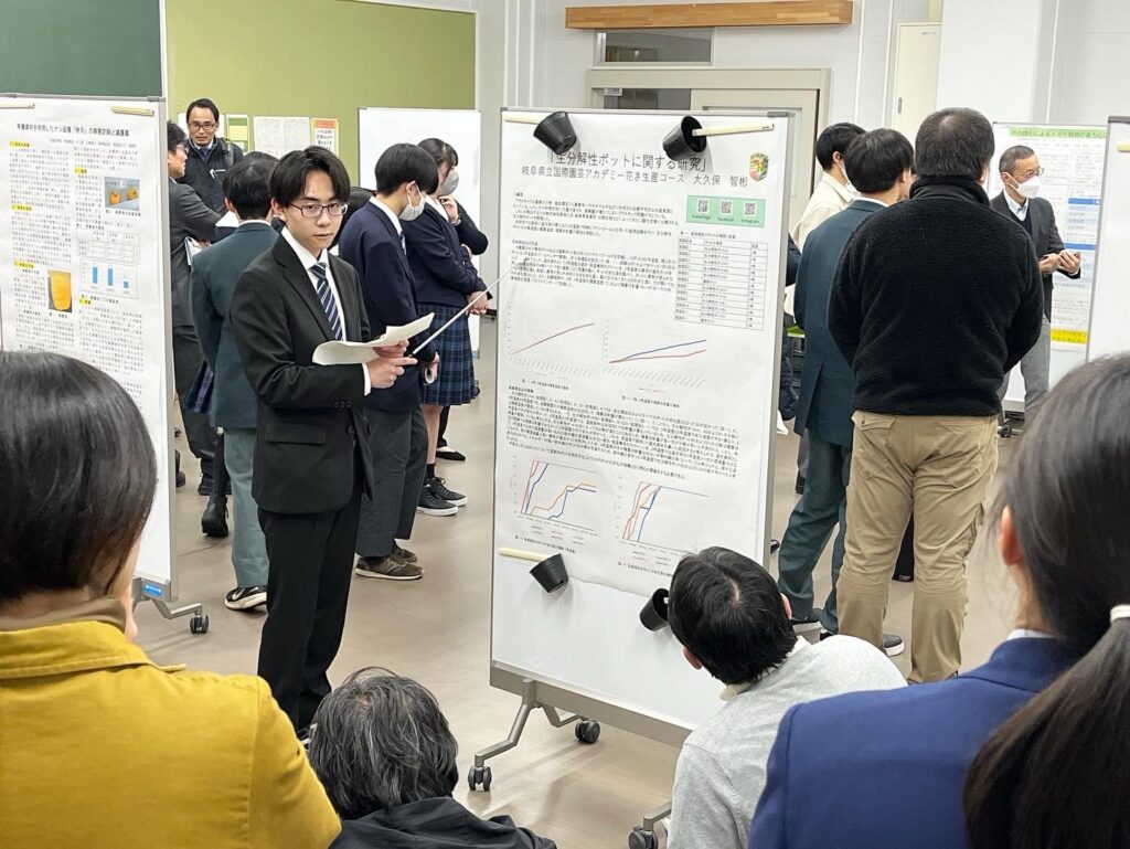 岐阜大学で開催された「第11回岐阜県域農林業教育システム研究発表交流会」に参加しました。花き生産コースが2課題の研究成果を発表し、うち1課題で優秀発表賞をいただきました。発表では岐阜大学応用生物科学部の先生方や、岐阜県内農林系高校の先生・生徒などからの研究に関するご意見、アドバイスもいただき、ありがとうございました。