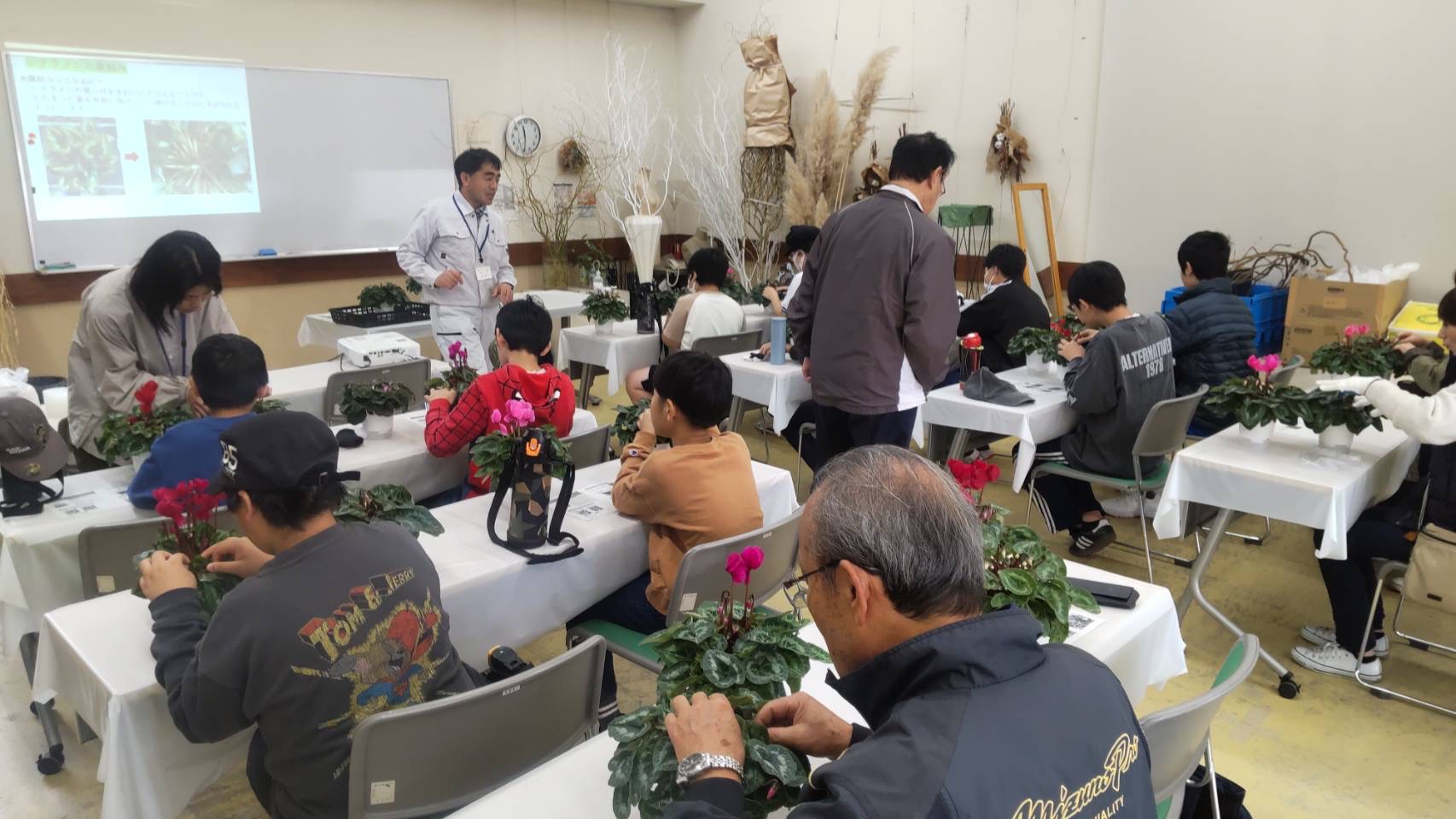 自分でシクラメンを選び、株の真ん中に光があたるように、葉っぱをきれいにそろえる作業をしていただきました。