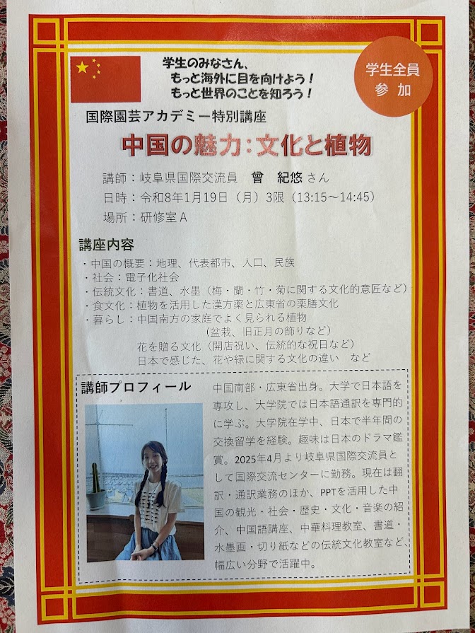 1月19日、岐阜県国際交流員の曾紀悠さんに「中国の魅力:文化と植物」と題してお話いただきました。今年度は、本学への海外イ...
