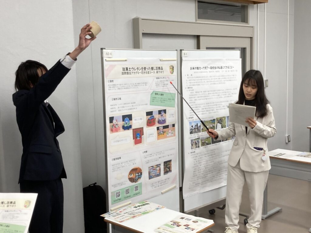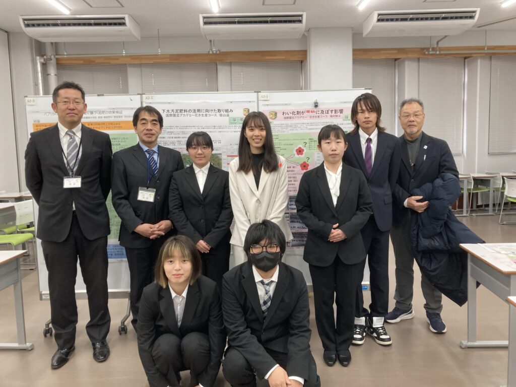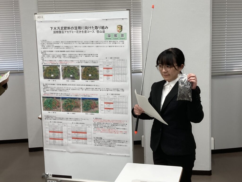 岐阜大学で開催された「第13回岐阜県域農林業教育システム研究発表交流会」において、花き生産コース2年生の3名がこれまで行ってきた研究課題についてポスター発表を行いました。大雪の影響により発表がキャンセルとなった課題もありましたが、県内農業高校など5校19課題の発表があり、大きな刺激を受けるとともに、有意義な交流の場となりました。岐阜大学の先生方をはじめ、様々な視点からいただいた指摘や質問に対しても、自分の言葉で回答する姿に学生のみなさんの成長を感じました。成果をまとめて自分の言葉で話すことは大変ですし緊張もしますが、将来必ず役に立つ経験だったと思います。学生の皆さん、お疲れ様でした!(雨宮)