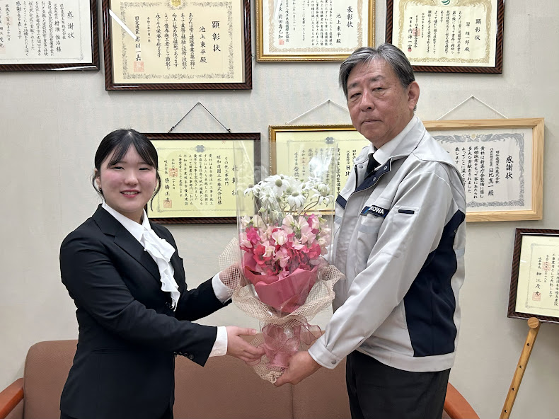 2月19日、昭和造園土木㈱様に伺い、3月に卒業を迎える学生が2年間の奨学金支援への御礼と学修成果や就職について日比真一社長に報告し、感謝の気持ちを込めて花束をお渡ししました。