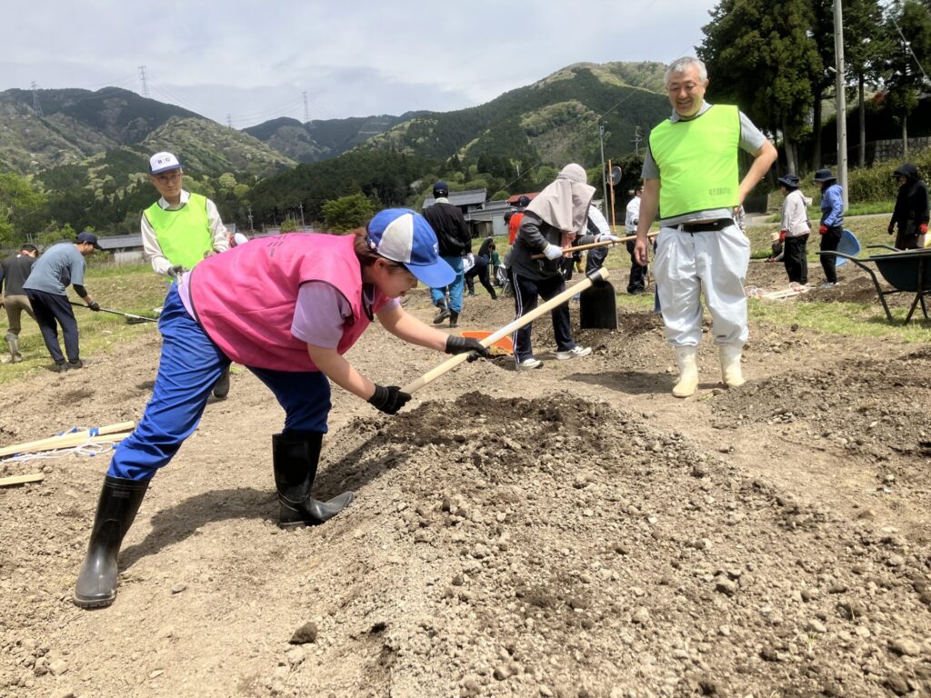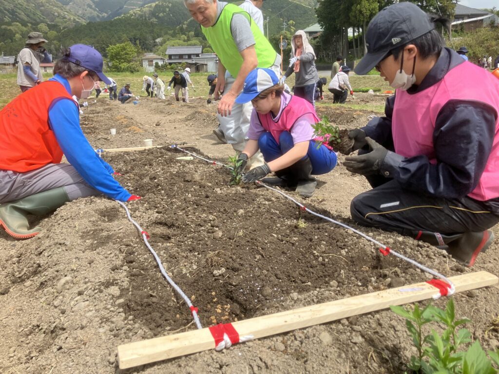 植栽ボランティアとして参加した4名の学生が、一般公募の約30名のボランティアさんとともに、看板の設置や圃場の整地、植栽作業を行いました。「観光以上・移住未満」の立ち位置で関ヶ原町の活動に継続的にかかわる、いわゆる「関係人口」の創出に向けて、植物を通じて一般ボランティアの皆さんと交流を深めることができました。学生にとっては他に代えがたい経験をさせていただき、関係者の皆様に御礼申し上げます。